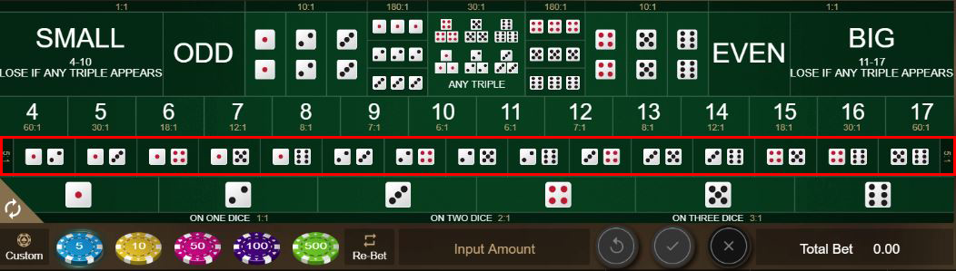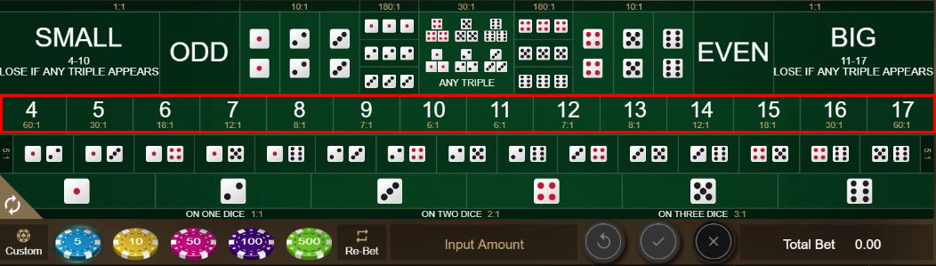 You can bet on the total number shown by the three dice. Although the total can range from 3 to 18, you can only bet on a Total of 4 to 17, because 3 and 18 are covered under Triple 1 and Triple 6 - see above.
